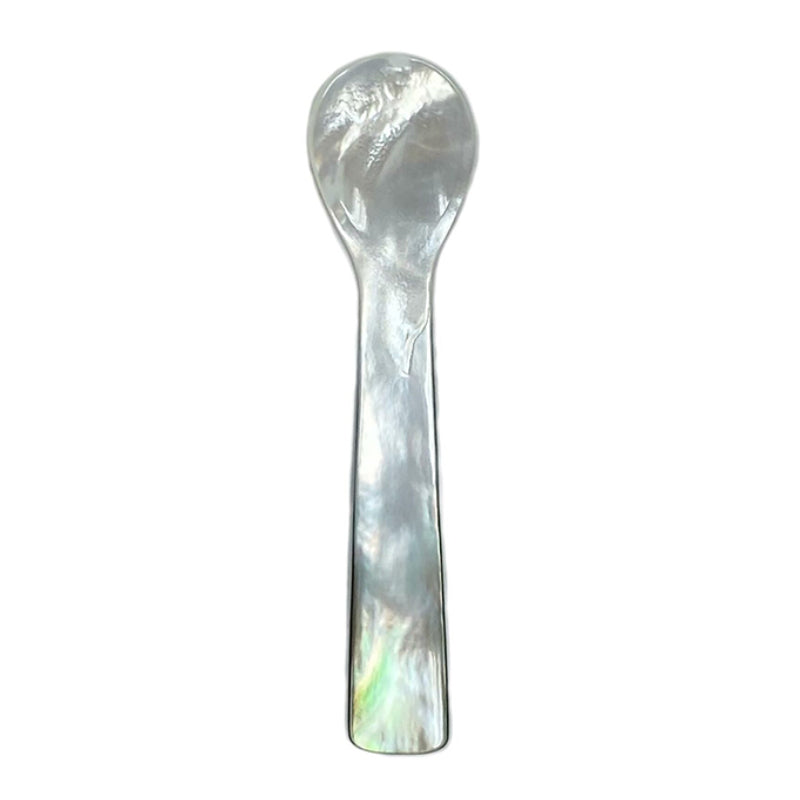 A tiny plate of glowing mother of pearl, with a gentle, fluctuating iridescence on its surface. Dark as the night sky, a pile of shimmering caviar sits on this chilly, iridescent canvas. The shiny, jet-black eggs contrast beautifully with the ethereal brightness of the plate. The nacreous surface reflects each small sphere of roe, enhancing its jewel-like appearance. They bring the two most valuable gems of the water together to form the ideal scene of marine luxury.