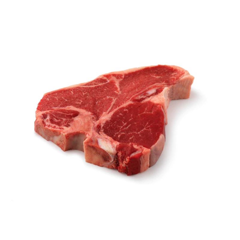 This well marbled cut is made up of two lean, tender steaks, the strip and tenderloin, that are joined by a T shaped bone. The tenderloin in a T Bone is 1/2 to 1 1/4 inches in diameter.